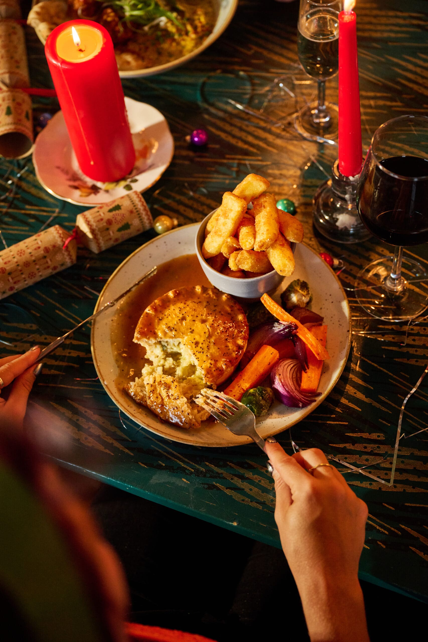 A person with short, colorful hair holds a dessert plate at a festive Christmas table decorated with red candles, crackers, wine glasses, and holiday lights. Other people are partially visible in the background.